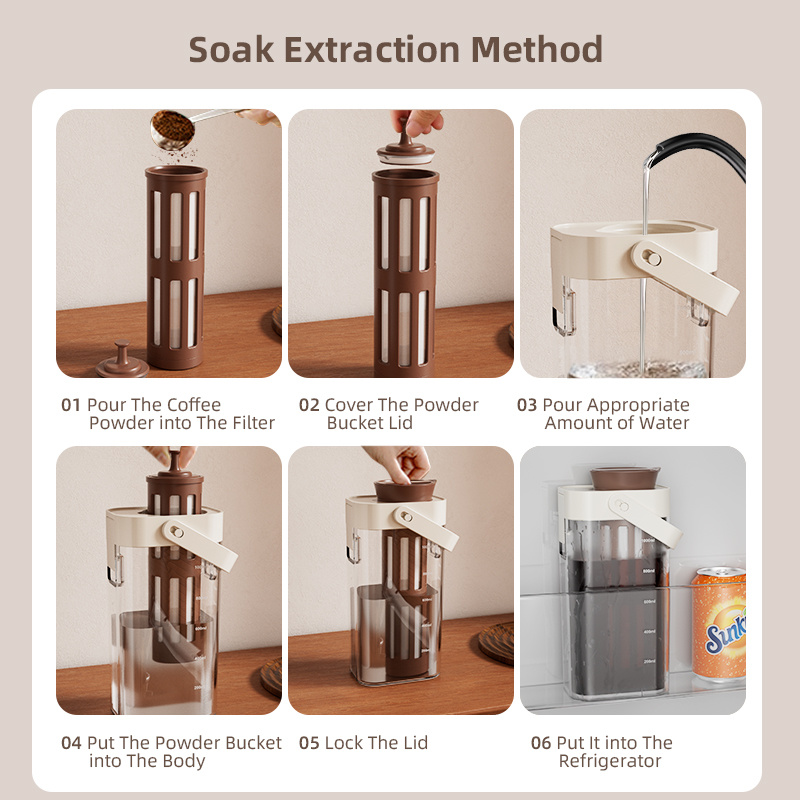 冷藏萃取:盖紧盖子,放入冰箱(2-5℃)冷藏12-16小时。使用加长滤网时:如果喜欢口感较淡,可缩短萃取时间1-2小时(细网萃取更高效);不要超过18小时,以免过度萃取。